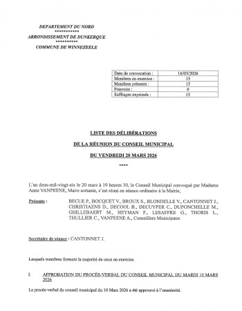 2026 - Listes des délibérations Cliquer pour passer 2026 - Listes des délibérations Liste des délibérations CM du 20/03/2026Publié le 31 Mar. 2026Consulter Slide précédente Prochaine slide Fin du carousel